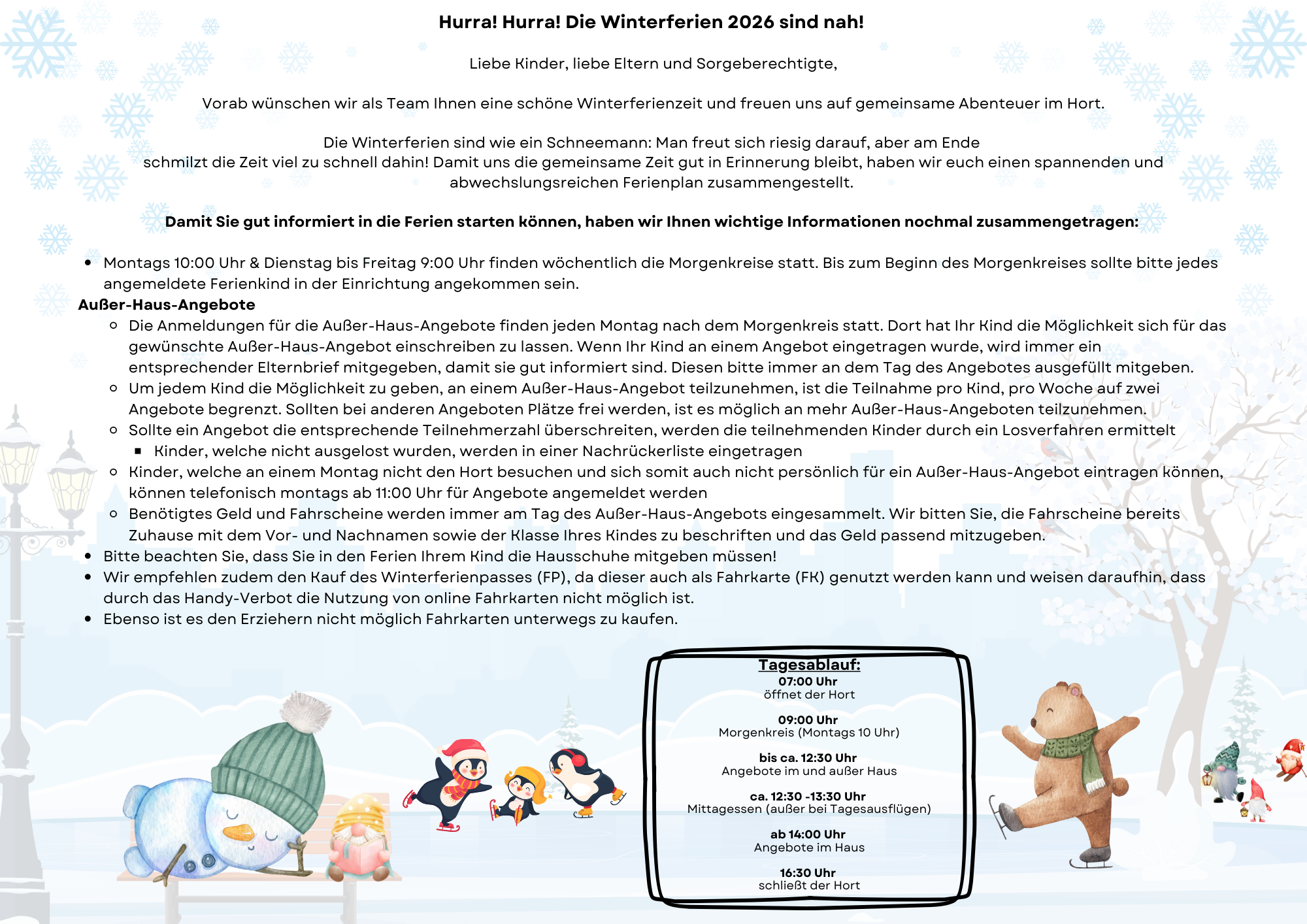 Beachten Sie, dass in den Ferien kein Schulbus fährt. Es gelten ausschließlich die angegebenen Geh- und Abholzeiten auf der Ferienanmeldung. Bitte benachrichtigen Sie uns schriftlich, sollte es hierbei zu Änderungen kommen.